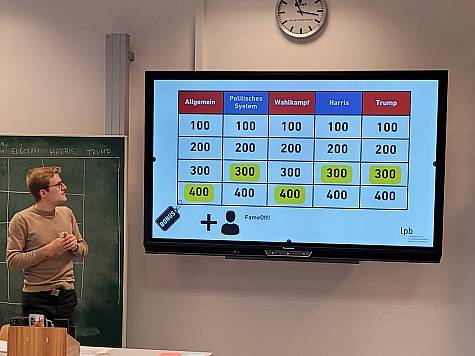 Doch welche Parteien nehmen an der US-Wahl teil? Warum ist die politische Atmosphäre im Land so aufgeheizt? Welche Promis unterstützen welche Kandidatin oder welchen Kandidaten? Das sind nur drei von zahlreichen Fragen aus 5 Themenbereichen (USA-Allgemein, Politisches System, Wahlkampf, Harris und Trump), bei denen die Klasse 2BFW1/1 der Berufsfachschule bei einem Jeopardy-Quiz ihr Wissen zur US-Wahl auf die Probe stellen konnten. Die 90-minütige Veranstaltung fand am 27. September 2024 unter der Leitung eines Teams der Landeszentrale für politische Bildung Freiburg (LPB) statt.