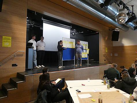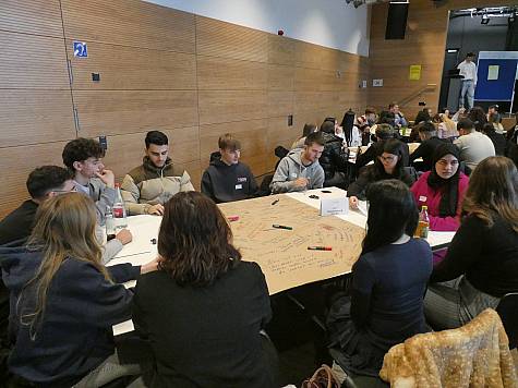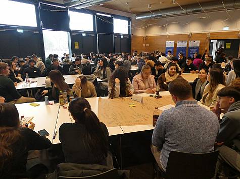Im World-Café-Format diskutierten die Schülerinnen und Schüler engagiert, hielten ihre Ideen auf Plakaten fest und präsentierten zentrale Ergebnisse anschließend auf der Bühne. Die Gespräche waren lebhaft, respektvoll und inhaltlich fundiert – ein eindrucksvoller Beleg dafür, wie reflektiert junge Menschen gesellschaftliche Herausforderungen betrachten.